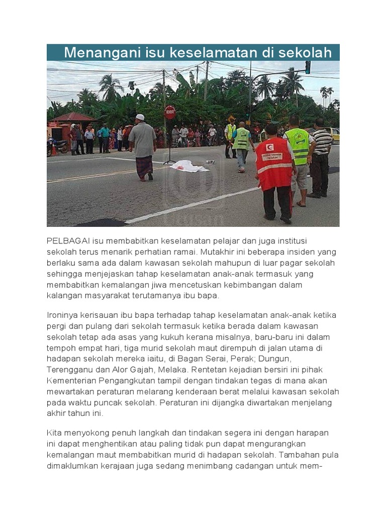 Shakil Hameed Noor Mohamad Menangani isu keselamatan di sekolah. Berikut dikongsikan contoh karangan cara-cara mengatasi masalah dan langkah menjaga keselamatan kanak-kanak untuk panduan semua. Namun dalam hal membabit- kan keselamatan anak-anak di dalam dan luar kawasan sekolah eloklah kita melihat isu inidalam konteks yang lebih besar supaya dapat menanganinya seeara me- nyeluruh hal ini penting kerana keselamatan murid sekolah tidak terhenti setakat kemalangan se- perti ini sebaliknya banyak lagi insiden yang turut mendedahkan.